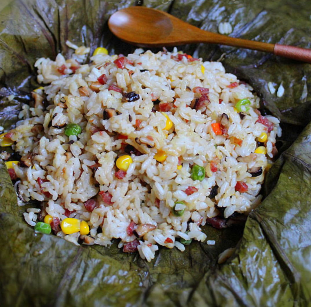 三、荷叶蒸饭。这是是一道营养丰富,鲜香味美的家常蒸饭。用做荷叶蒸饭的米饭可以用糯米饭,也可以用糯米和普通米各半,还可以只是普通米饭都可以。米饭里的配料也可以自行选择,如青豆、玉米、干贝、火腿肠等都可以,当米饭吸收了佐料的精华,再加上荷叶的清香,简直美味不可挡。